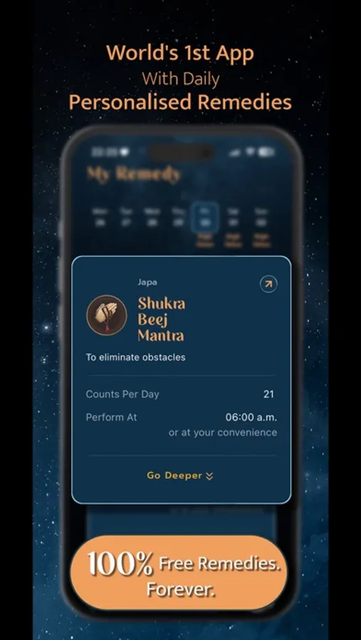 We are the world’s first app to provide you not just a customised remedy but also the ability to perform it yourself - anytime, anywhere! Change your horoscope with a 10-minutes-a-day remedy, sometimes less!