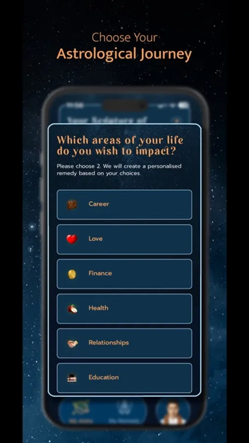 Your horoscope will focus on two areas of life that you choose, plus two other areas chosen by our expert Vedic astrologers. The eight areas of life currently available in the app to choose from are: