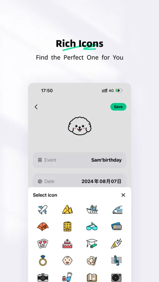 Choose from hundreds of exquisite icons to mark each event with a unique symbol. Customize the appearance of each countdown to reflect your style, making every milestone visually distinct and special.