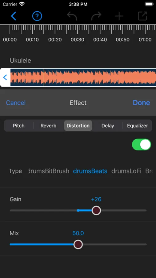 - Add effect: reverb, distort, equalizer, fade in, fade out...