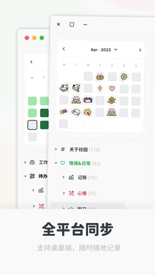 时刻日记支持多平台,你可以在电脑或移动端中使用它。我们还搭载了云同步的功能,让你随时随地记录生活的点滴。赶快下载试试吧。