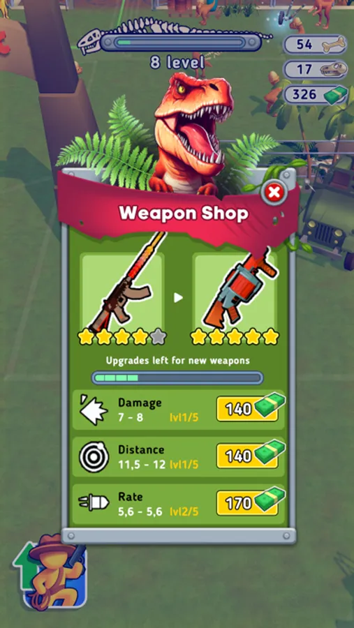 Upgrade and buy new weapons to defend yourself. Find spare parts that will help you to fix the helicopter and get out of this Jurassic Park.