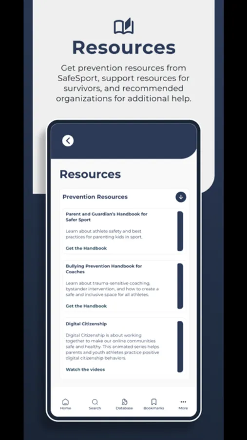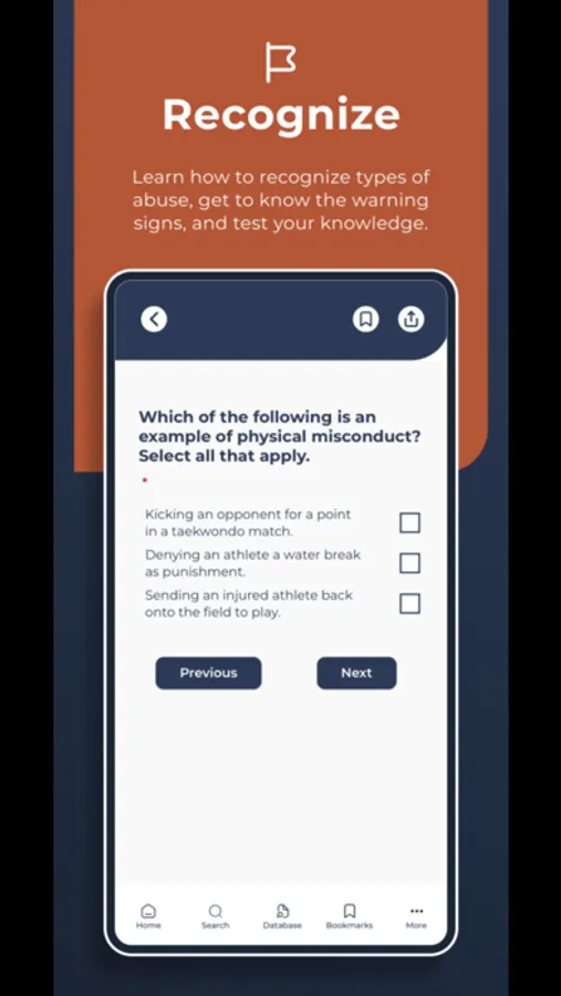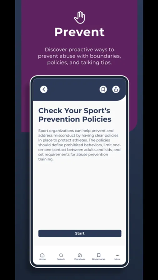 Learn about different types of abuse (bullying, emotional and physical misconduct) and explore examples, discover how to recognize signs of misconduct, understand what grooming is, and find out what defines a positive sport environment—all in one app.