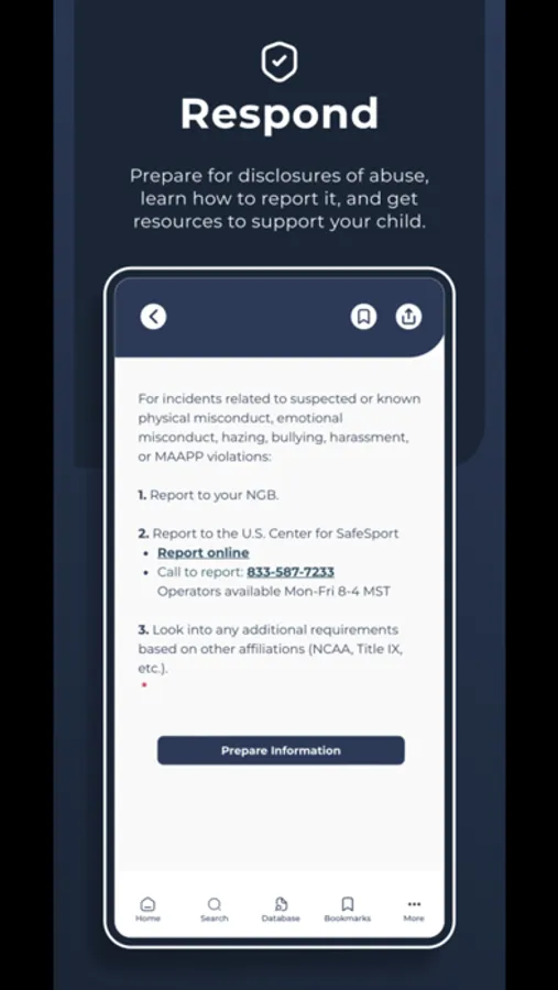 Concerned about behavior you’ve witnessed between teammates? Unsure if your child’s coach is acting appropriately? Open the app and get quick, trustworthy answers to all your questions about abuse and misconduct on and off the playing field.