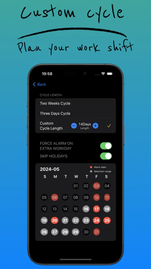 - Customize scheduling cycles to your preference, whether it's alternating weeks or unique schedules like working three days and resting two.