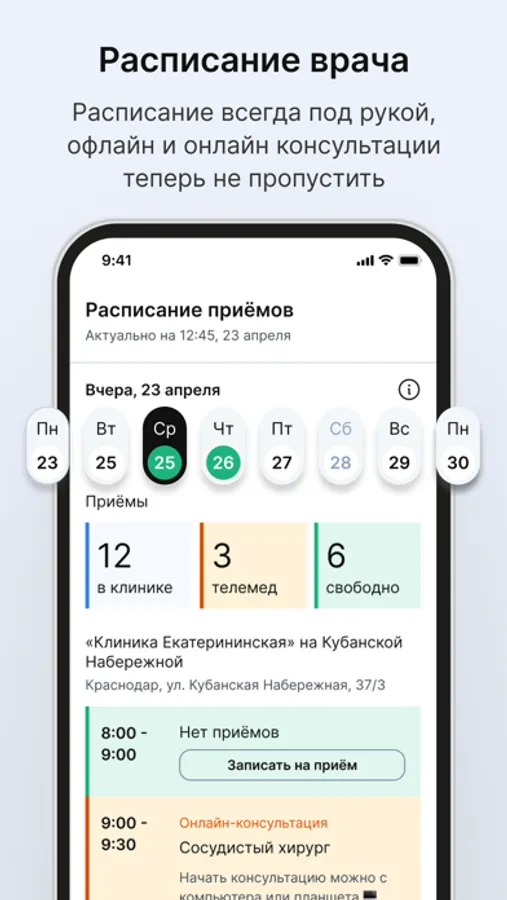 В приложении отображаются все ваши предстоящие приёмы из МИС. Если работаете в нескольких клиниках, сможете увидеть своё расписание в каждой из них.