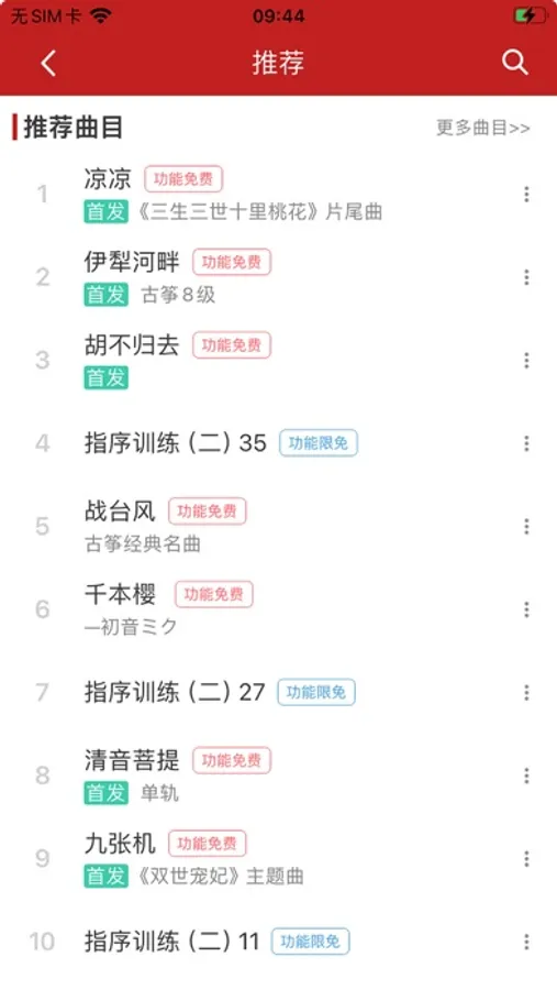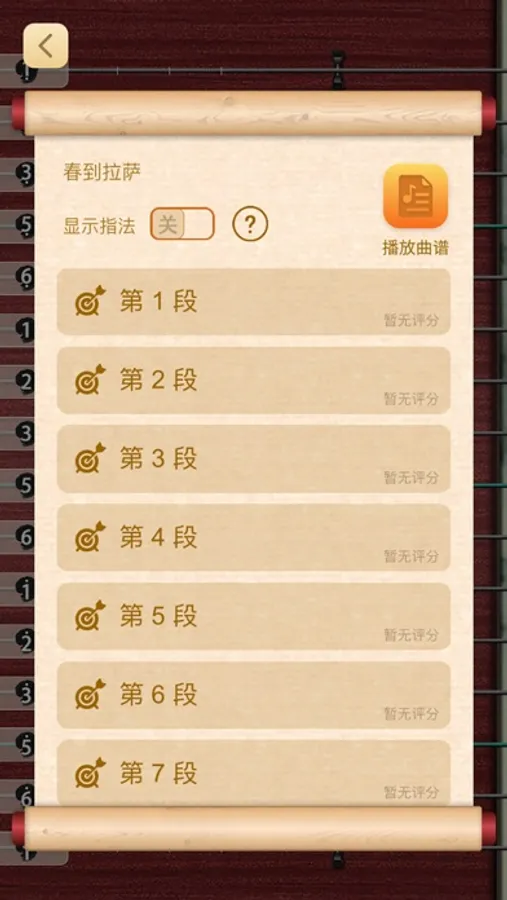 2.歌曲页面,纳入了许多古筝考级曲、练习曲等,以及曲谱