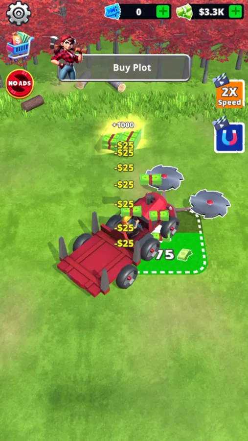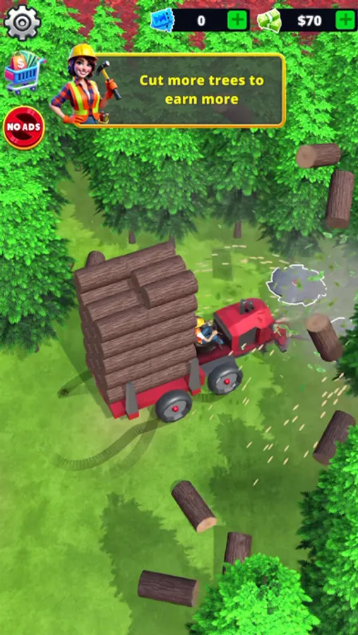 Cut Trees: Start by cutting trees and selling lumber to earn money. Upgrade your harvester to cut trees faster and more efficiently.