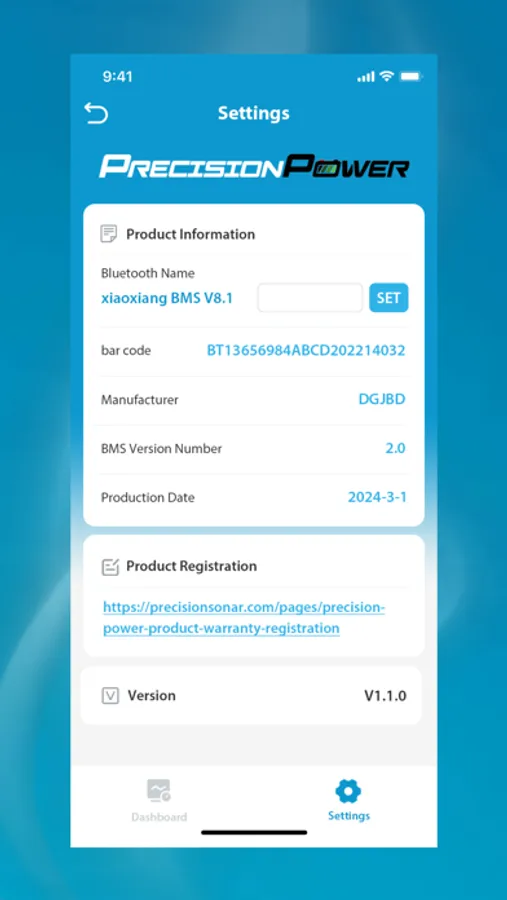 4) The "Settings" tab include some device info, Such as Bluetooth Name, BMS Version Number, Production Date, Version and so on.