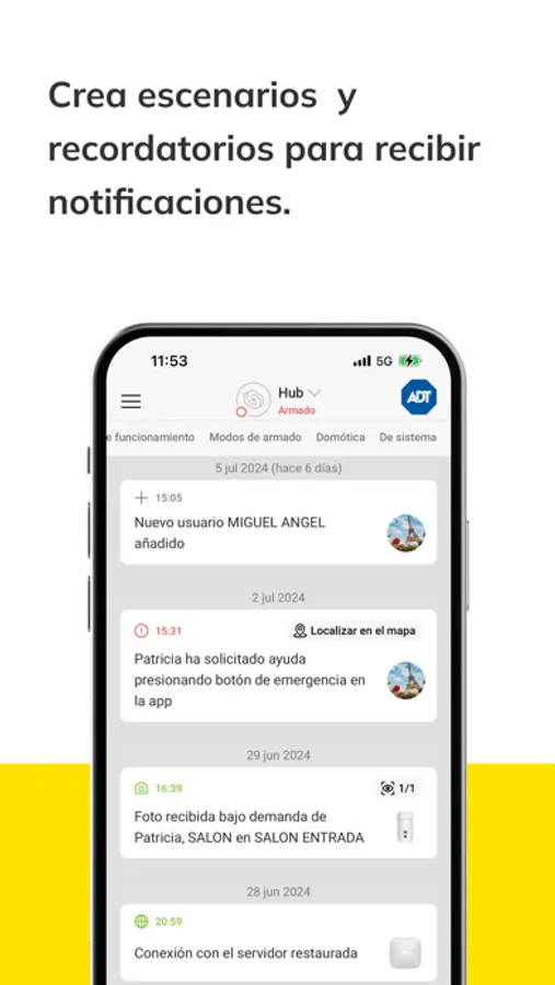 La app MASMOVIL ADT Alarma protege tu casa o negocio y te permitirá controlar tu seguridad. Podrás conectar o desconectar tu alarma desde cualquier lugar, visualizar lo que ocurre, crear escenarios, solicitar ayuda a través del botón de pánico y activar recordatorios para que tu instalación siempre esté protegida. Además, si surgen problemas, el sistema de seguridad activará inmediatamente las sirenas, te avisará a ti y a la Central Receptora de Alarmas de ADT que dará aviso inmediato a la policía.
