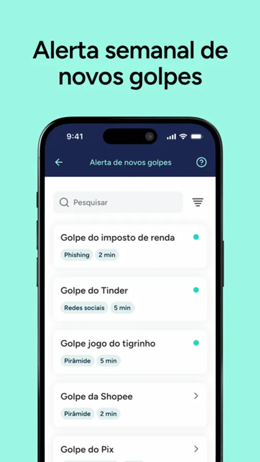 • Alerta de Novos Golpes: push semanal com os golpes do momento para você se prevenir e compartilhar com a família [100% gratuito]