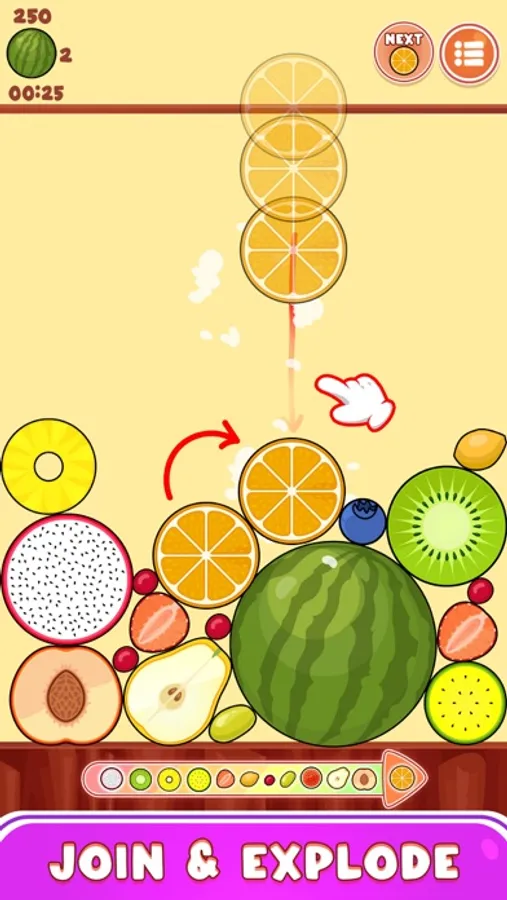 Embark on the hottest trend in mobile gaming with fruit merging! Merge identical fruits to unveil larger and juicier varieties, progressing through stages to increase your experience. Aim high to reach the highest level before time expires, creating the ultimate fruit and diving deep into the game. Your ultimate goal? Skillfully merge all fruits to conquer the latest level, testing your puzzle-solving skills in a visually appealing fruit-filled world.
