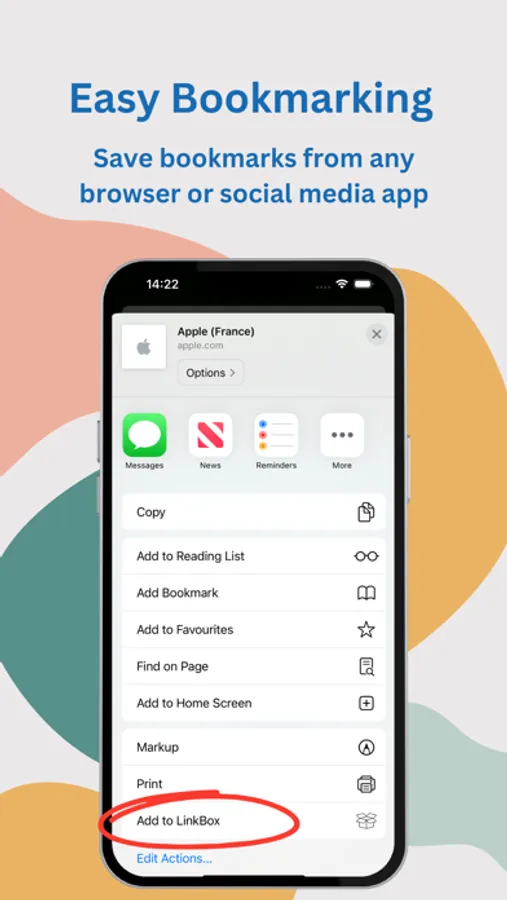 * Easy Bookmarking: Save bookmarks from any browser or social media app. Just click 'Share' and choose Add to LinkBox to store your link instantly.
