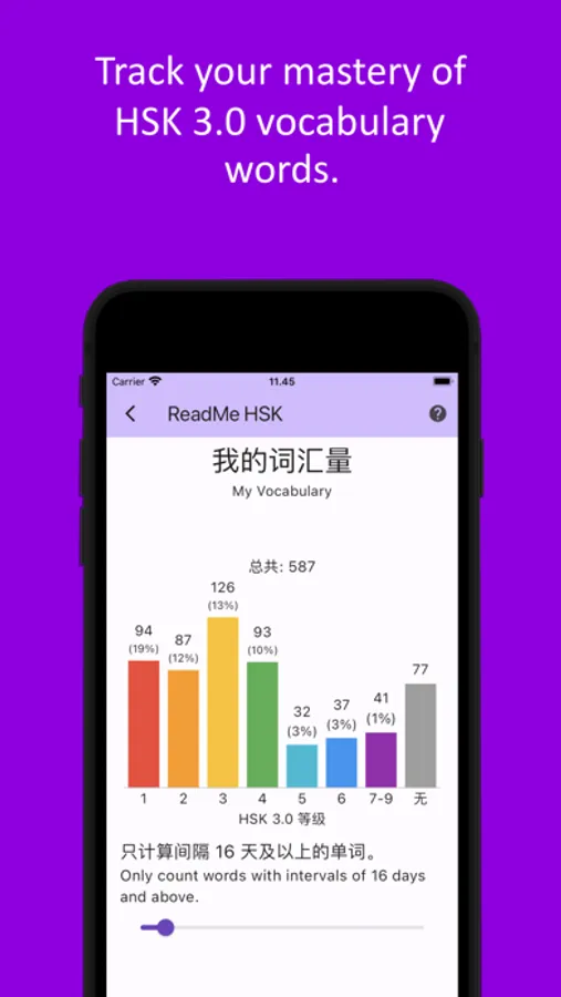 • Statistics of how many words from each HSK level you have mastered.