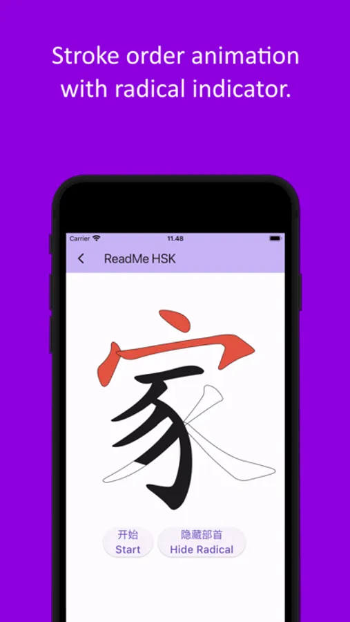 • Stroke order animation with radical (部首) indicator.