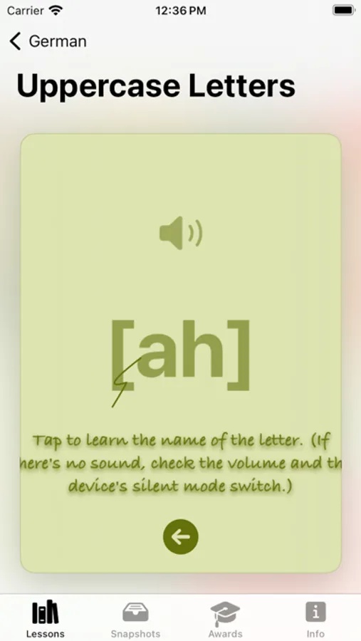 Access German learning flash cards, phrasebook-style exercises, and more advanced lessons via in-app purchase.