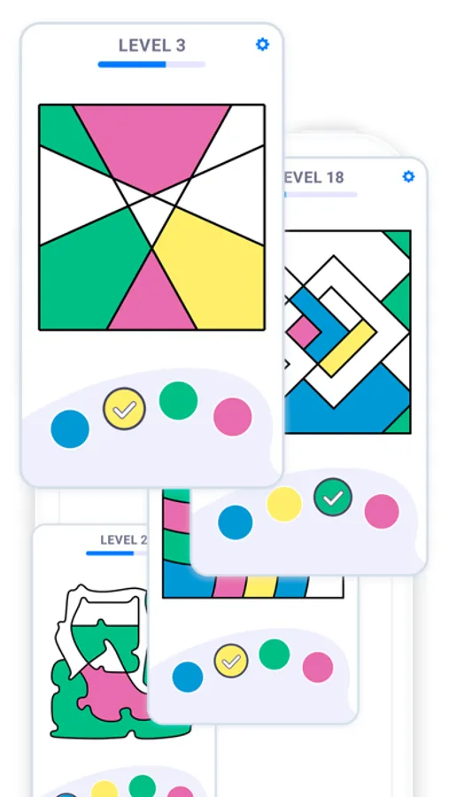With each move, you'll need to consider the implications on neighboring sectors and anticipate the best placement of colors to avoid violations of the color-sharing rule. As you progress through the levels, the puzzles become increasingly challenging, requiring you to think several steps ahead and devise creative solutions to overcome obstacles.
