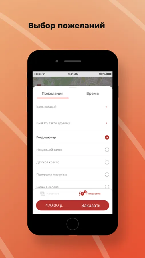 Добавьте к заказу дополнительные пожелания. Например, когда на улице +35 — выберите "кондиционер". Если вы не переносите запах табака — укажите "Некурящий салон", и к вам приедет некурящий водитель.