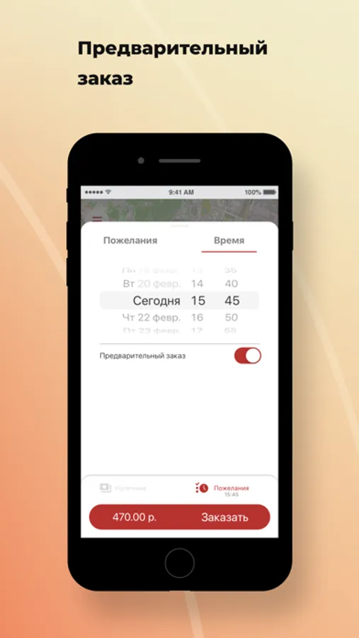 Выберите опцию "Предварительный заказ". Поиск автомобиля начнется незадолго до заказа поездки, и автомобиль приедет к назначенному времени. Также вы будете заранее знать стоимость поездки.