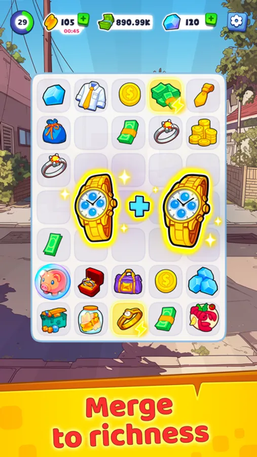 In "Merge Millionaire" game, the main goal is to combine identical items to enhance your level. Each merge brings you closer to completing core tasks that are integral to progressing in the game. Achieve the required item levels to unlock currency, propelling your rich story and unlocking new chapters in your character's life.