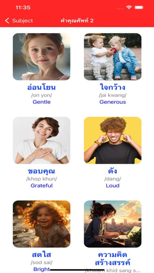 Learn Thai Language has 44 topics which are around you real life, 1909 words vocabulary with sound and images of them . You can use all of them without network, it’s free.