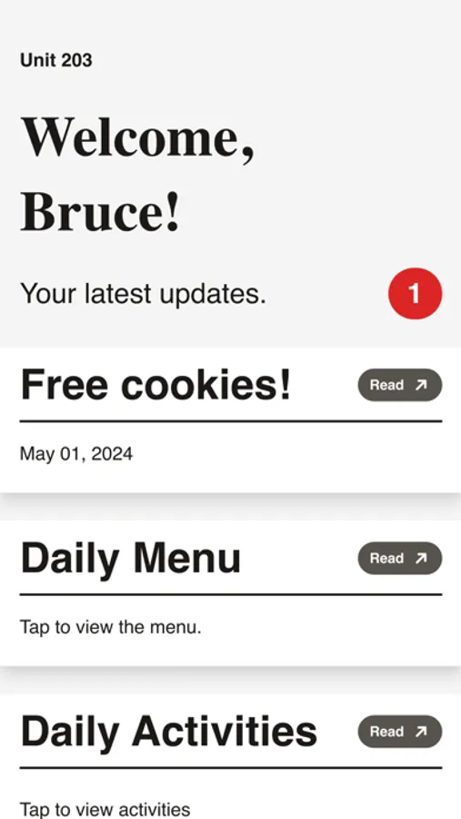 A communication app for senior living organizations focused around the user. The interface is simple to use, accommodates large screen text, uses natural and native gestures, and is ADA compliant. Enhance your senior resident's experience with up-to-date information in a format that is accessible and easy to consume.