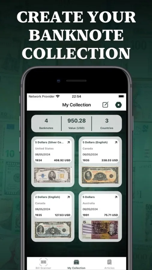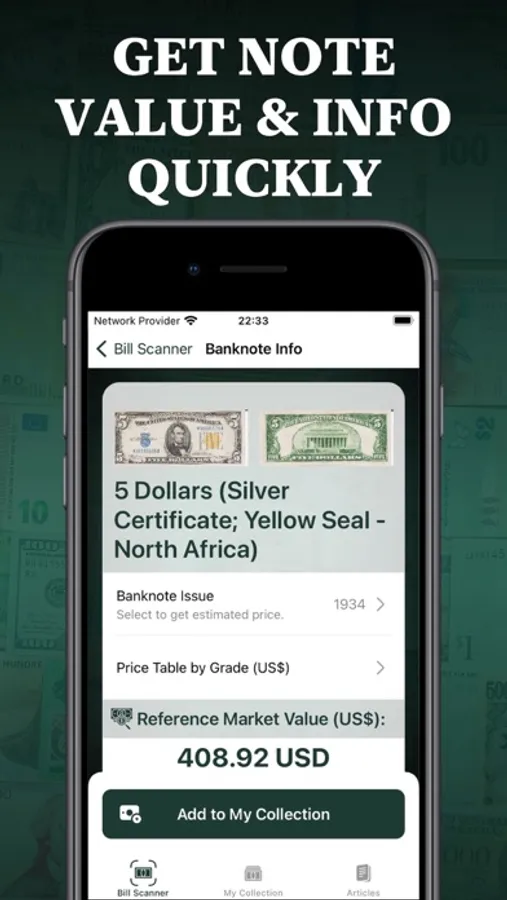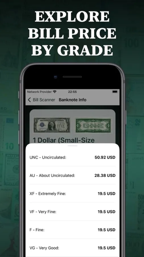 Dollar Bill Scanner app turns your device into a powerful, fast and accurate banknote scanning, identification, value and collecting tool! Just snap photos of both sides of the banknote and get the scan result in seconds with detailed info about your note. Improve your banknote collecting experience and expand your knowledge with this helpful app.