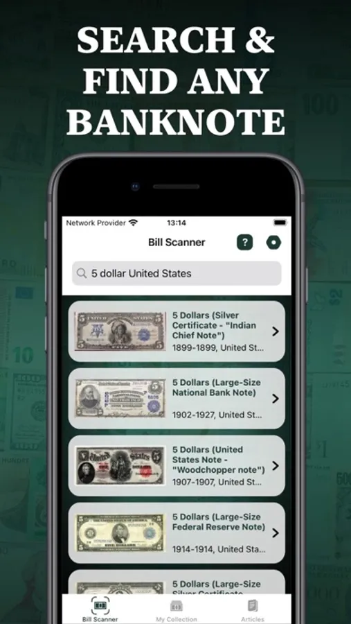 Dollar Bill Scanner is a useful app made for banknote collectors, enthusiasts and numismatists of every level. Scan, identify and value 110,000+ varieties for 42,000+ banknote types from around the world. Build, keep and manage your personal banknote collection, also track its value in one app easily. Search and find any banknote with easy-to-use search tool. Study 33+ educational banknote articles.