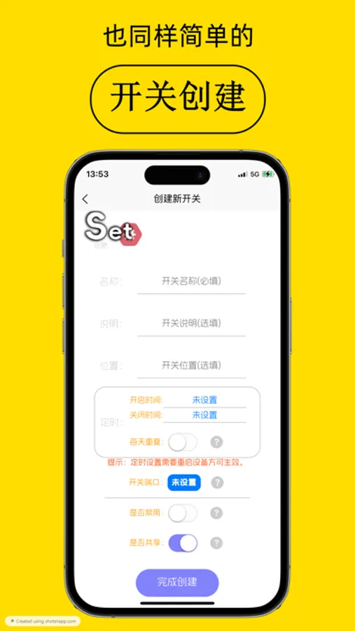 可以配合开关插座、开关模块、控制盒、ESP32/ESP8266+多路继电器模块、等硬件产品来创建您的专属网络开关,支持多路控制,只要有网络您就可以在千里之外甚至者火星之上轻松控制你想控制的任何设备,亦可将该开关分享给他人,他人可以直接共享使用这个开关,当然,您还可以限制他的开关使用次数。