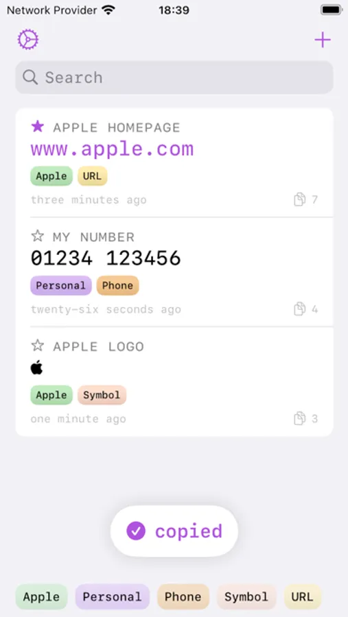 Each item displays a descriptive title alongside its copyable content. Tapping an item copies the text to the pasteboard for you to quickly share or use in other apps. Items can be organized using tags and favorites, and can be sorted alphabetically, by date, or by the number of times they’ve been copied. A search bar allows you to find a specific item using its description. Simple & fast, that’s Copyboard.