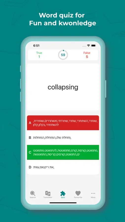 Challenge your language skills with our engaging English to Hebrew Word Quiz Game! Test your vocabulary, expand your linguistic horizons, and have fun while learning. This interactive quiz game offers an exciting way to improve your command over both English and Hebrew. With a wide range of words and challenging questions, you can enhance your language proficiency. Our English to Hebrew Word Quiz Game is your perfect choice.