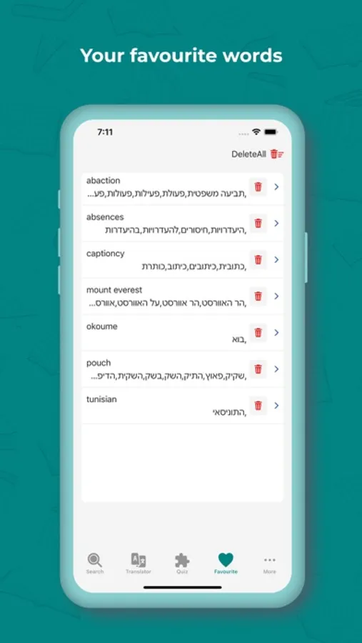 Save your favourite word meanings with ease! Just tap the heart icon, and we'll automatically add the word to your favourites list. Access your saved words effortlessly anytime you want through the 'Favourites' option in the tab bar at the bottom.