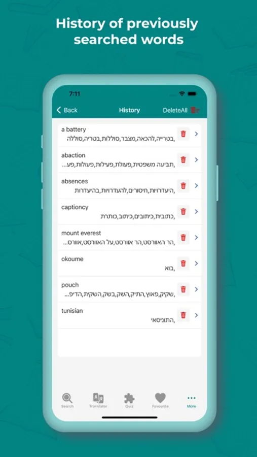 We take the history of previously searched words in English to Hebrew Dictionary Offline App. Easily access and review your past searches, making it a breeze to revisit and reinforce your vocabulary.