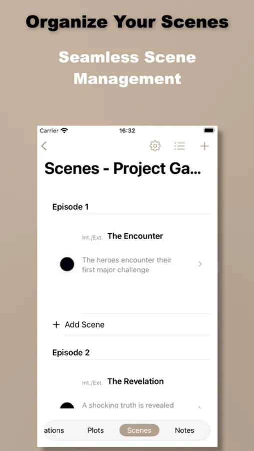 Seamless Scene Structuring: Build your story scene by scene. Organize your manuscript or script with flexible scene cards or lists. Add summaries, tag locations, track characters involved, manage timelines, and note crucial story beats within each scene. Easily reorder scenes as your plot evolves, ensuring a smooth narrative flow and perfect pacing.