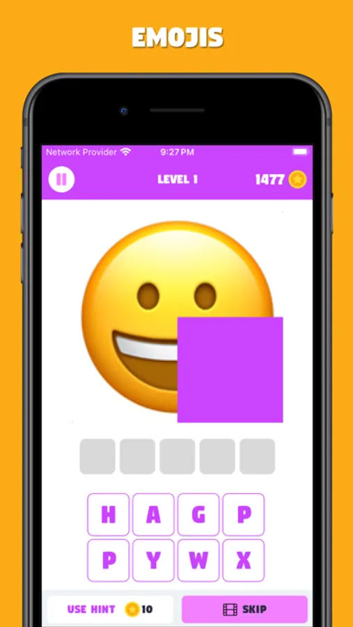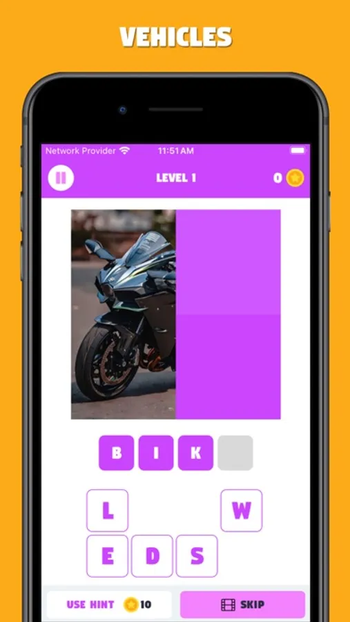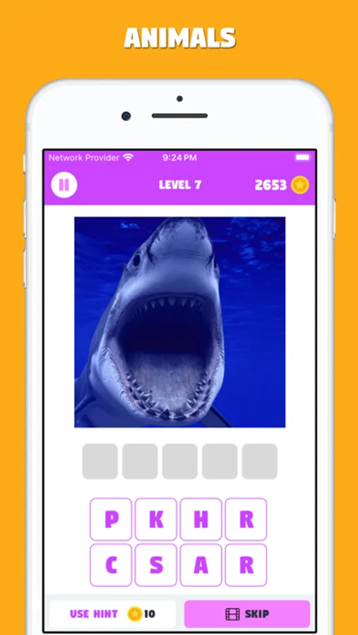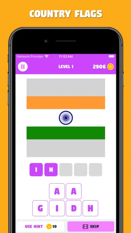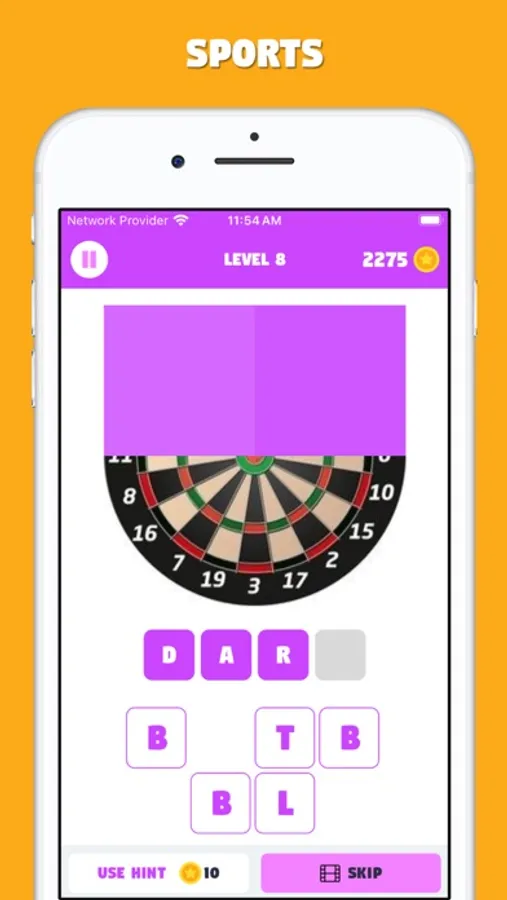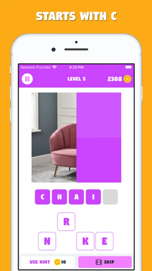 * Use hints to automatically reveal correct letters in the word. Each hint costs 10 coins. Need to skip a level? Watch an ad and move on to the next challenge.
