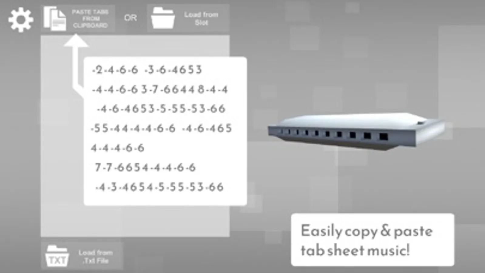 Paste harmonica tab sheet music from websites and train visually.