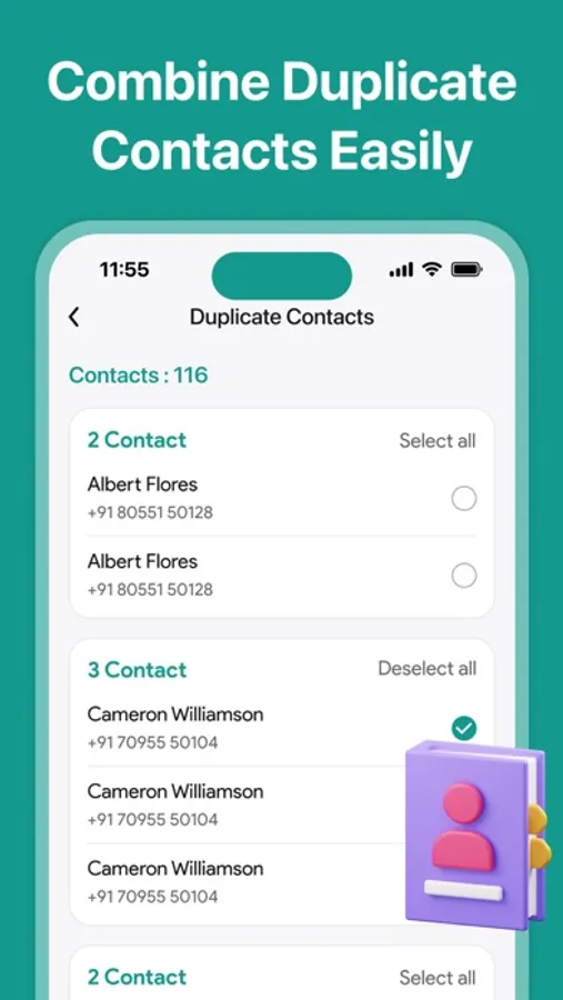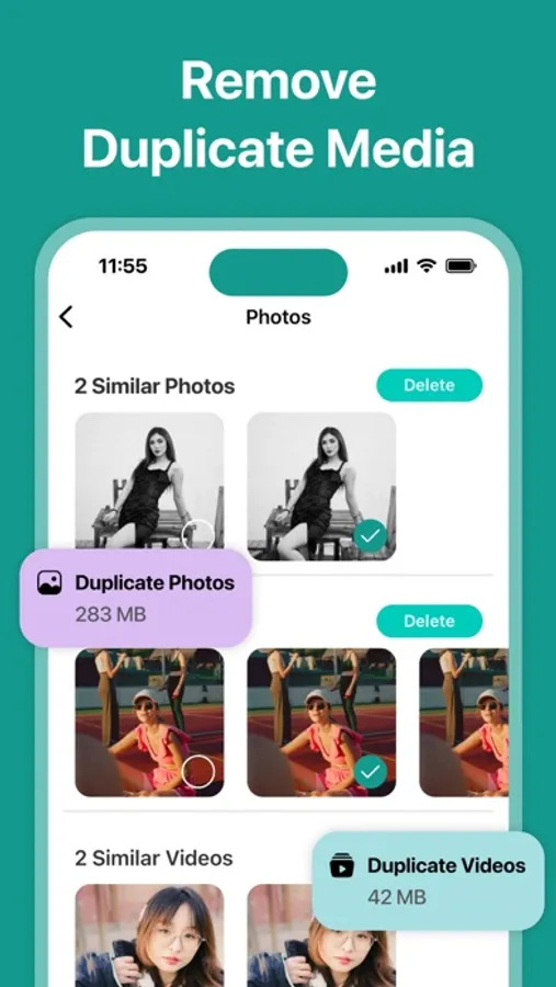 Free up space by identifying large photos and videos and also easily delete duplicate photos, videos