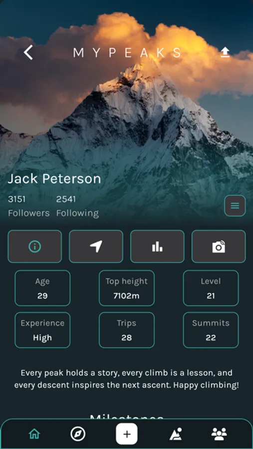 User profiles come alive with motivational bios and stunning banner images, capturing the essence of each climber's passion. MyPeaks takes pride in bringing your profile to life with dynamic tracking of all your climbing statistics. From the number of climbs, elevations reached, and distances traveled, to the specifics of each unique expedition, MyPeaks captures every detail, allowing you to review and relive your accomplishments over time.