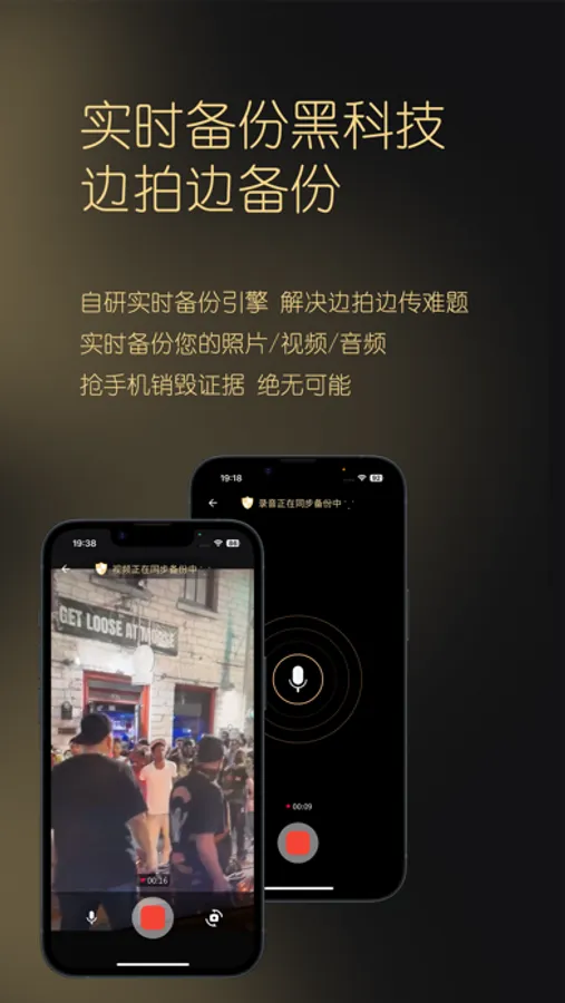 【安全录像】,拍摄视频,录像过程中视频实时同步备份到您的云端私有空间中,无需担心拍摄过程中手机被抢,数据被删除