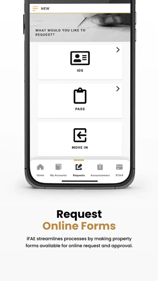 - Need to submit a request for repair, permission to bring items inside the property, or invite a guest? Users can fill out and submit various forms online such as ID registration, guest and gate pass, and work permit. iFAE will streamline the process, eliminating paperwork and reducing response time.