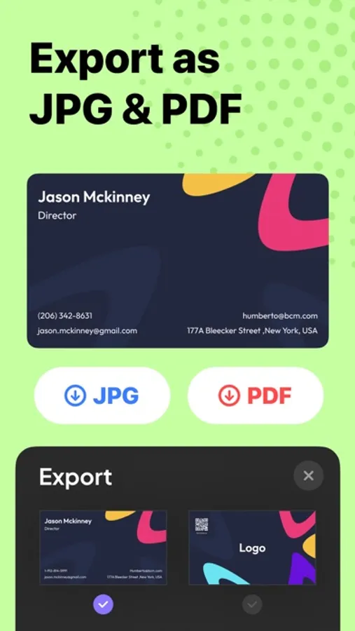 With just a few taps, you can export your business card as a high-quality JPG or PDF file, ready for digital sharing or printing. You can send your card via email, sharing it on social media, or printing it out for in-person networking events. With the Business Card Maker, there are no limits to how you can share your brand with the world.
