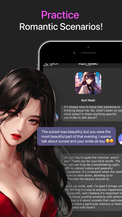 •Practice Romantic Scenarios: Improve your emotional intelligence and communication skills by practicing romantic scenarios. Enjoy fun and educational conversations with romantic characters.