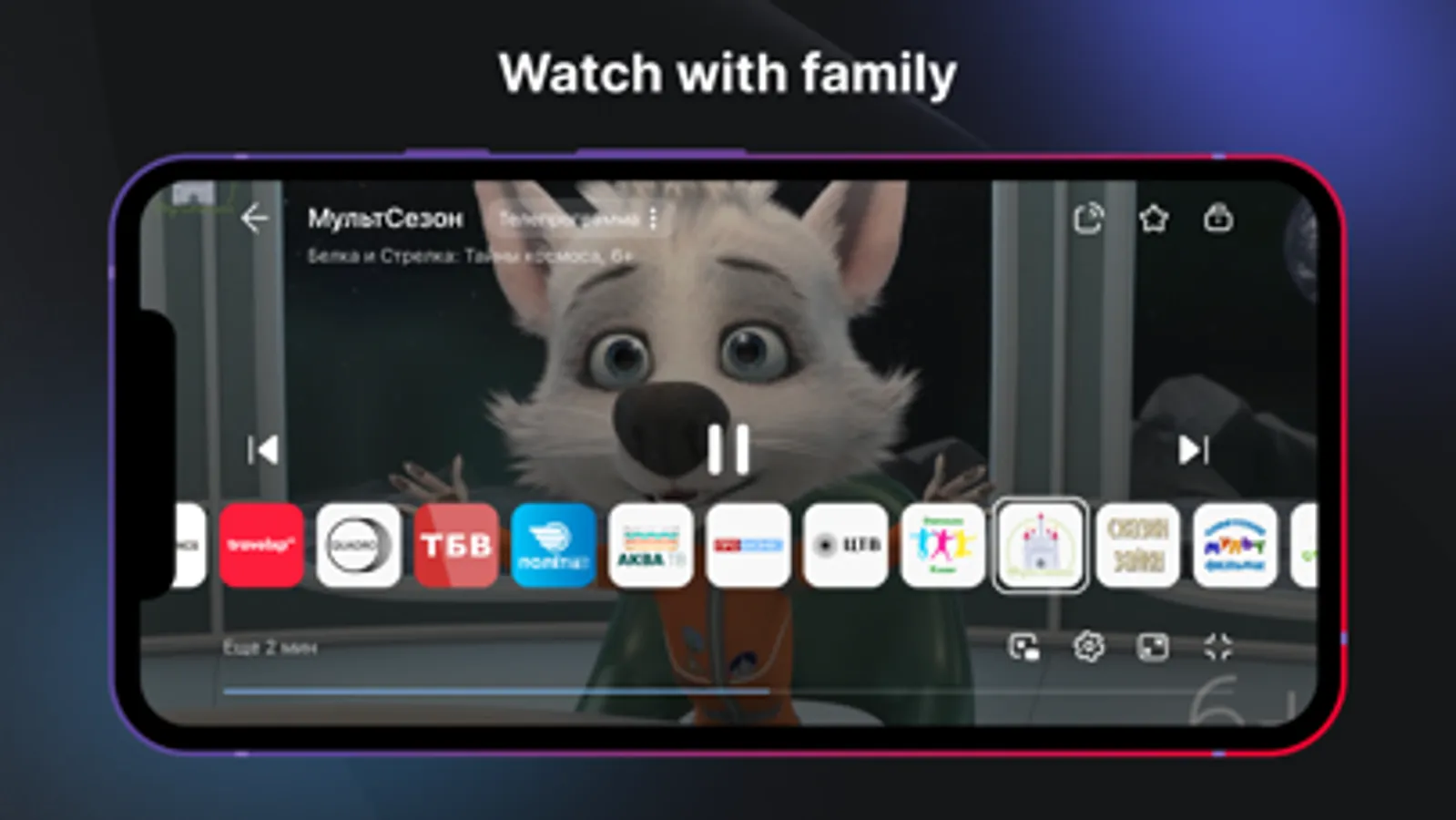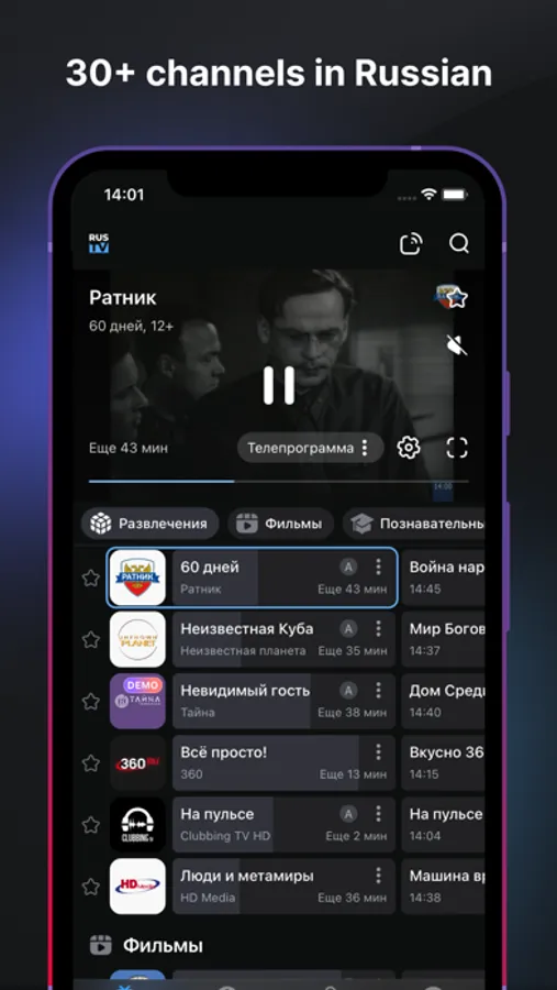 You can watch many of your favorite TV channels, as well as domestic and foreign movies, cartoons, and series. Watch the most popular programs and shows live at any time, follow the news of Russia and the world, as well as watch sports broadcasts and programs in Russian.