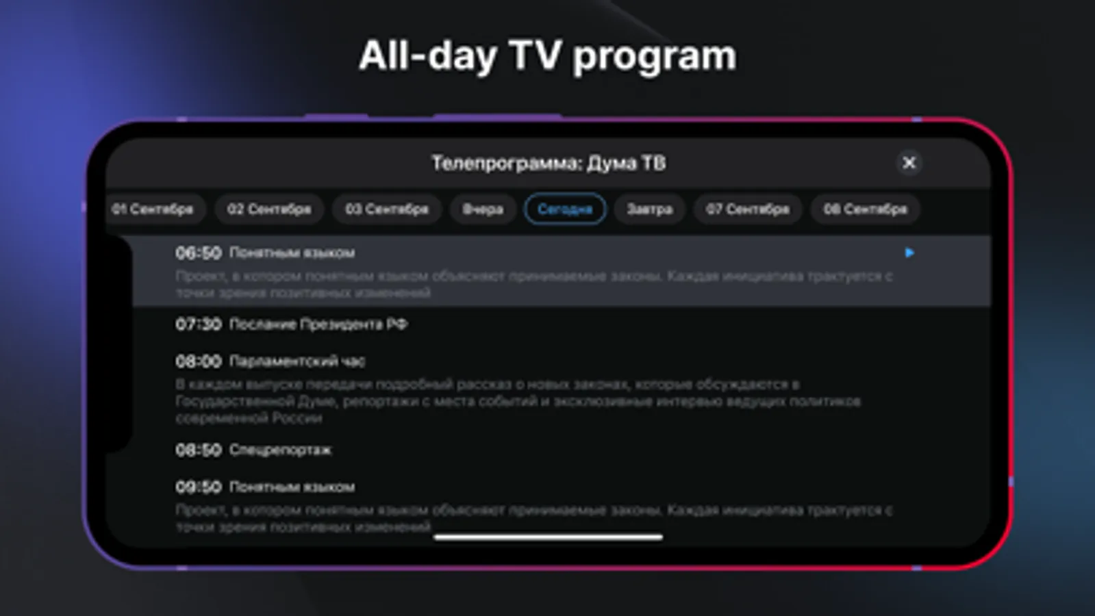 "Russian TV: Live Stream is a service where you can watch live broadcasts of popular Russian TV channels in HD quality. You can watch your favorite movies, shows, sports, and other TV content. Our application - a complete TV and digital TV in your phone.