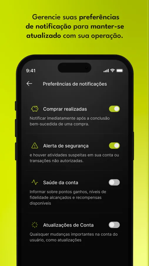 - Gerencia as preferências de notificações para manter-se atualizado de sua operação em tempo real.