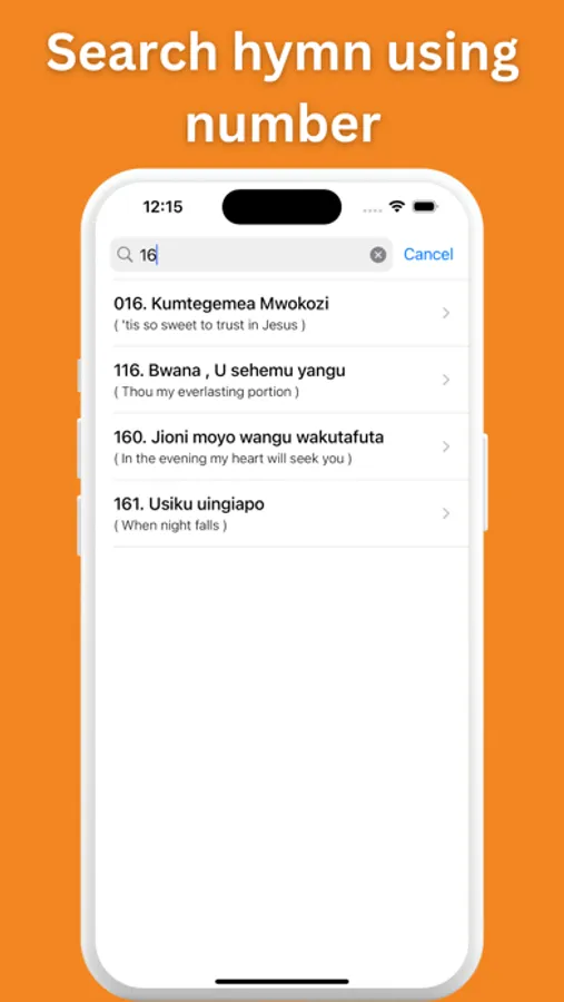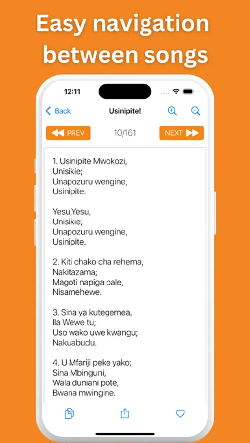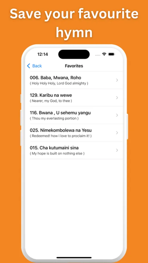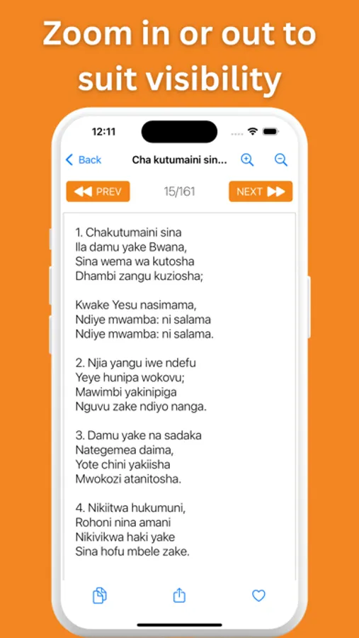 You get access to features that will make your use easier. Search for any hymn book easily from the home page, use song number or song title to search for the songs. You can easily change the font size by zooming in/out in the song display screen. Furthermore, you can save any hymn to favourites from the song display screen. To view your favourites, navigate to the favourites tab.