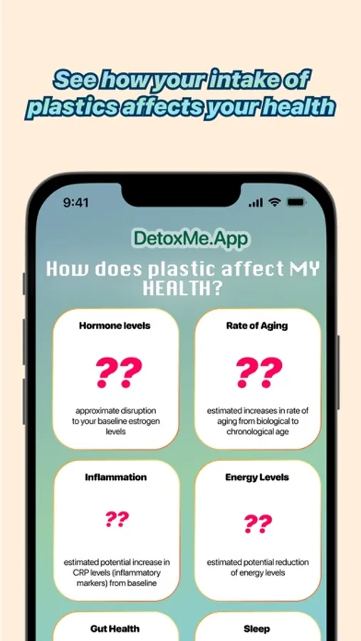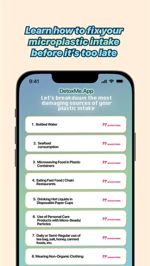 DetoxMe is a powerful and user-friendly app designed to help you understand and minimize your microplastic exposure. With personalized insights and actionable tips, DetoxMe empowers you to make healthier choices for you and your family.