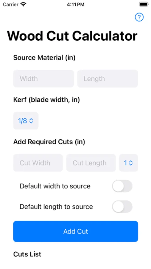 * Cut List Management: Add, edit, and manage a list of required cuts with ease. Our app supports multiple quantities of cuts and allows you to set default dimensions to match your source material.