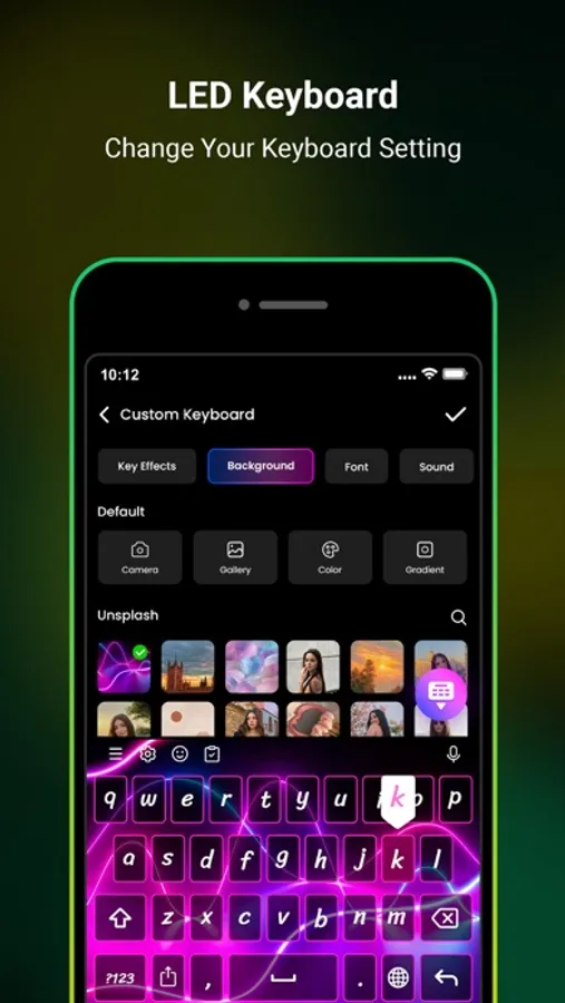 • Change the background keyboard with various colors or images, change color levels, stroke, color gradient speed effect, etc.