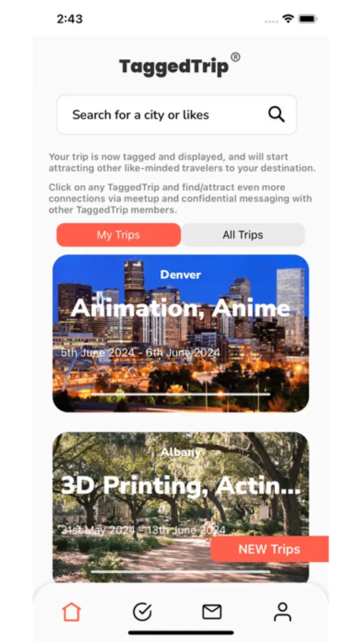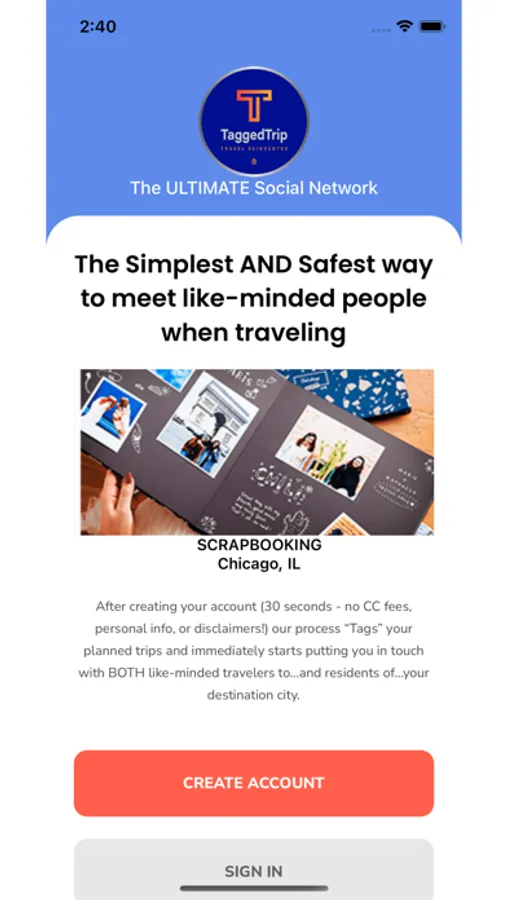 The Simplest and Safest way to meet like-minded people when traveling. Once you sign-up on your mobile APP, any planned future trips become Tagged Trips automatically "attracting" other like-minded travelers to meet up with you at your destination and connect you with groups/events that match your profile.